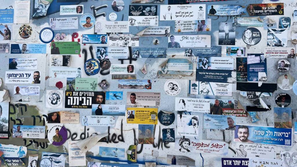 Mit diesen Aufklebern wird in Israel Zivilisten gedacht, die am 7. Oktober und in den Tagen danach ermordet wurden. Zudem sind sie Soldaten und Sicherheitskräften gewidmet, die infolge des Hamas-Überfalls und des seit fast zwei Jahren tobenden Mehrfrontenkrieges fielen.