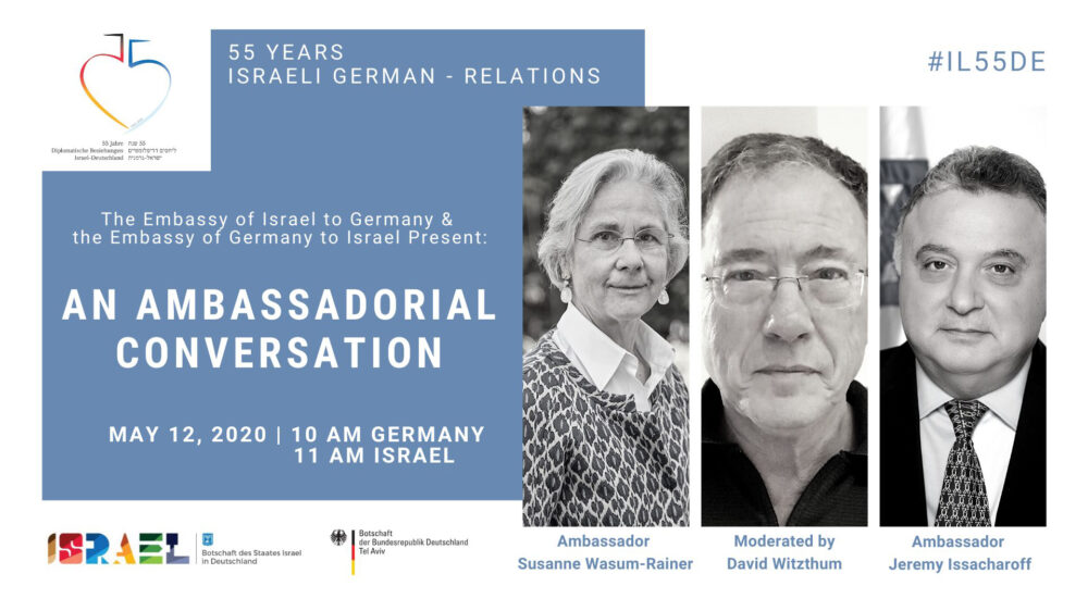 BERLIN / TEL AVIV (inn) – Vor 55 Jahren nahmen Israel und die Bundesrepublik Deutschland diplomatiische Beziehungen auf. Zum Jahrestag wollen sich der israelische Botschafter Jeremy Issacharoff und die deutsche Botschafterin Susanne Wasum-Rainer am 12. Mai zu einem Online-Gespräch treffen. Sie werden sich „um 10 Uhr deutscher Zeit über die Geschichte und Gegenwart der Beziehungen austauschen und auch aktuelle Themen in Politik und Gesellschaft ansprechen“. Das Gespräch wird vom israelischen Journalisten und Historiker David Witzhum moderiert und findet auf Englisch statt.