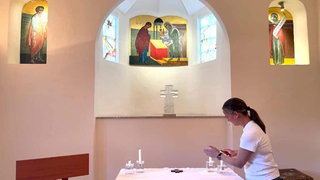 Die Ikone erinnert an die christlichen Wurzeln im Judentum. Wir verweilen noch einen Moment schweigend in der Birgitta-Kapelle und lassen die Strahlkraft der Ikone auf uns wirken.