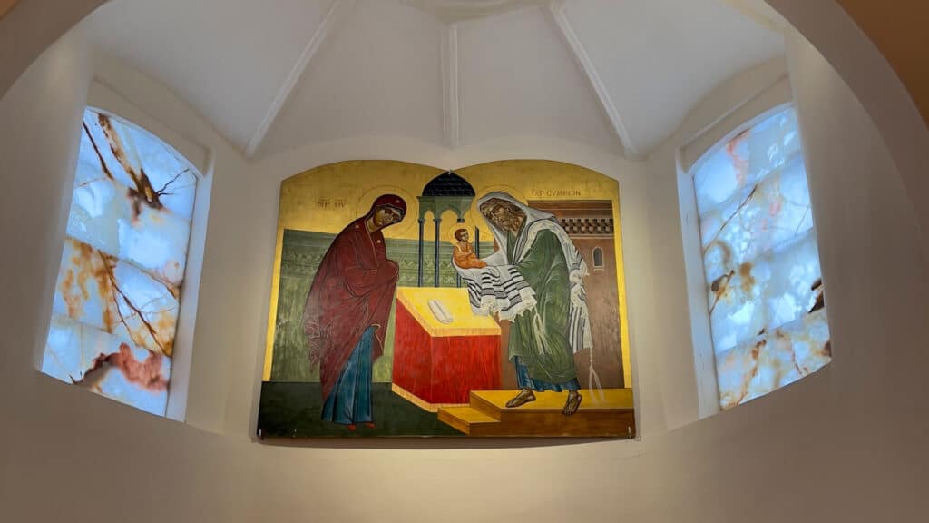 Die Ikone zeigt Simeon eingehüllt in seinen Tallith, den jüdischen Gebetsschal. Wie im 4. Buch Mose 15,37–41 steht, sind die vier Schnüre ein Zeichen des Bundes zwischen G´tt und seinem Volk Israel sowie eine stetige Erinnerung an seine Gebote. Simeons Gebetsschal erinnert uns daran, dass Jesus ein Jude ist und in die Obhut des jüdischen Volkes übergeben wird. Wenn Jesus seiner jüdischen Identität beraubt wird, wird er zu einem anderen Jesus als der, den die Kirche mit dem Evangelisten Johannes (1,14) bekennt: