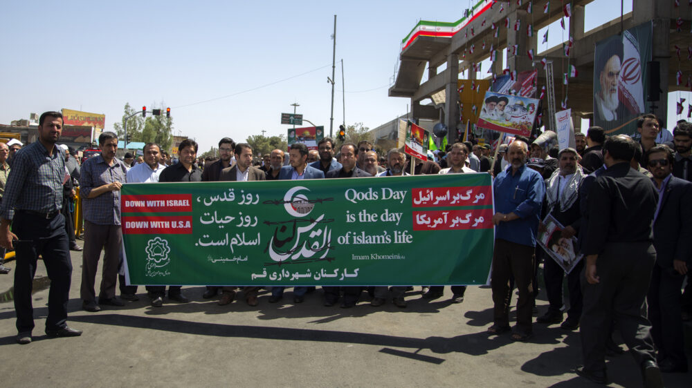 „Muslime müssen wachsam gegenüber dem gemeinsamen Feind bleiben und den Verschwörungen von Israel und seinen Unterstützern widerstehen“, erklärt das Außenministerium weiter. Der internationale Al-Quds-Tag wurde Ende der 1970er-Jahre vom iranischen Revolutionsführer Ajatollah Chomeini eingeführt, um für die „Befreiung Jerusalems von den zionistischen Besatzern“ zu demonstrieren. Die Veranstaltungen dazu beginnen jährlich am letzten Freitag des Fastenmonats Ramadan. Der Tag, der nach dem arabischen Namen für Jerusalem benannt ist, wird regelmäßig dafür genutzt, um gegen Israelis und Juden zu hetzen.