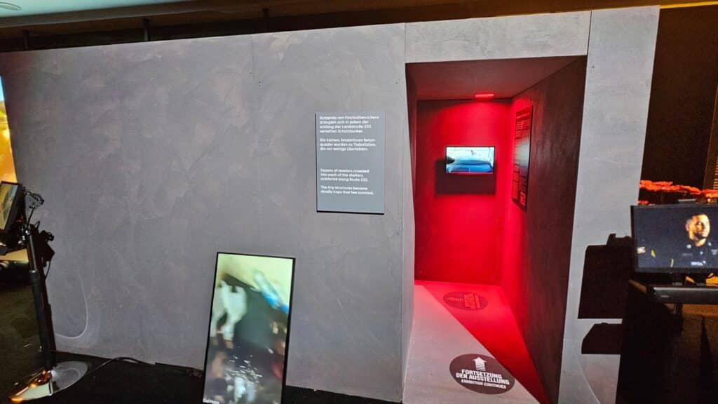 Am Rand stehen zwei nachgebaute, in rotes Licht gehüllt Bunker. Solche befanden sich an der Landstraße 23, in der Nähe des Festival-Geländes. Darin suchten viele Festival-Besucher Schutz vor den Raketen. Als die Terroristen kamen, wurden diese fensterlosen Betonquader jedoch zu tödlichen Fallen.
